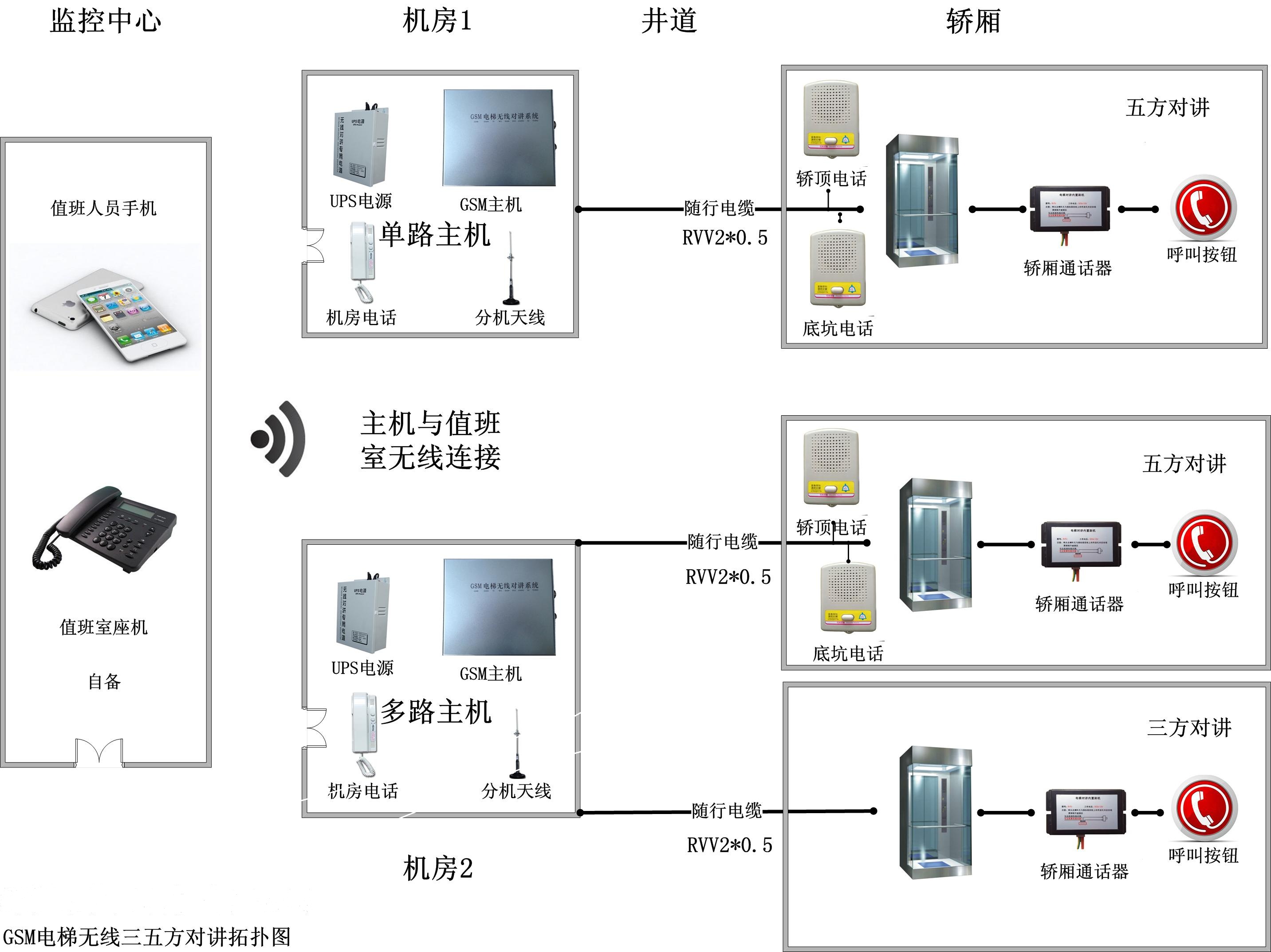 安裝方法:將電梯無線對講主機安裝在電梯機房。首先使用劃線器標出安裝位置,用電鉆鉆孔,將螺栓把主機固定好。最好安裝在離門窗近的地方方便無線信號的接收和發(fā)射,把12V-UPS電源插在電源接口上,打開電源,看電源燈是否已變亮,看主機側面電源燈是否變亮,變亮表示主機已處于正常工作狀態(tài),把機房電話接入電話接口處,最后再插入控制線到通話器接口上,把控制線上的兩條(黃綠)線接入準備好的兩條隨行電纜上,這時機房設備已全部安裝完備(注:每臺主機可接三臺電梯)。